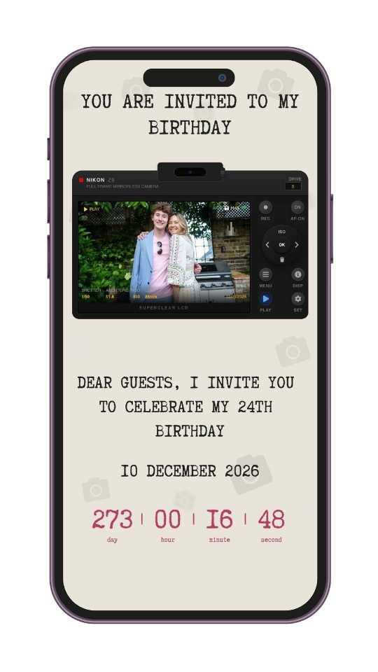 Modern camera-themed birthday invitation with photo gallery, invitation text, multiple locations with maps, dress code, and questionnaire with drinks & song preferences.